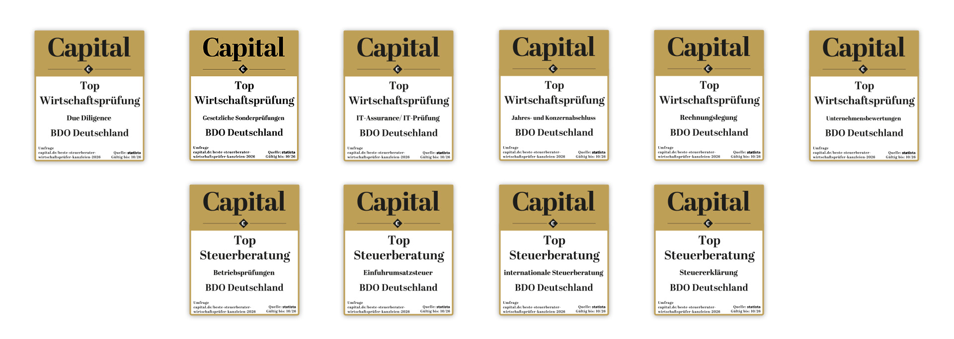 In 2025, the business magazine Capital, together with the market research institute Statista, identified the best tax consulting and auditing firms in Germany for the first time. BDO AG Wirtschaftsprüfungsgesellschaft was awarded in 11 specialist fields.