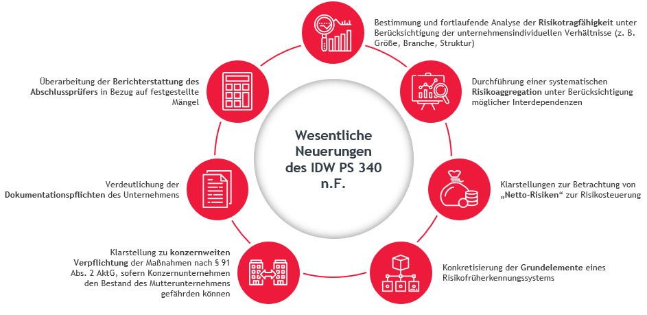 Die zu prüfenden Grundelemente werden im IDW PS 340 n.F. nun explizit als solche benannt. Das Risikofrüherkennungssystem hat zu enthalten: Risikokultur, Ziele der Maßnahmen, Organisation der Maßnahmen, Risikoidentifikation, Risikobewertung, Risikosteuerung, Risikokommunikation, Überwachung und Verbesserung.