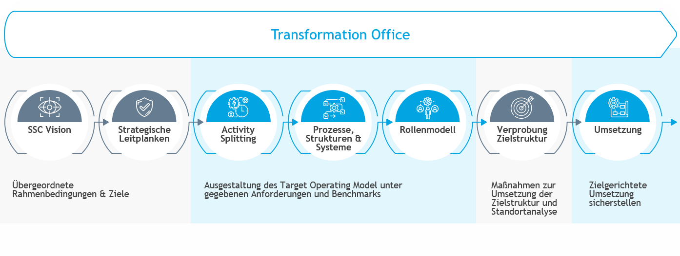 Nach eingehender Prüfung auf Eignung relevanter Prozesse für eine mögliche Bündelung in ein Shared Service Center wird die Umsetzung dieses Vorhabens anhand BDO‘s strukturierten und bewährten Modells initiiert und intensiv begleitet. Diese Programme sind in der Regel von hoher Interdisziplinarität geprägt. Nicht nur Transformationsmanagement - auch steuerrechtliche, arbeitsrechtliche und ggf. umwandlungsrechtliche Kompetenzen sind gefragt. Hier steht BDO mit seinen ganzheitlichen Kompetenzzentren an Ihrer Seite.