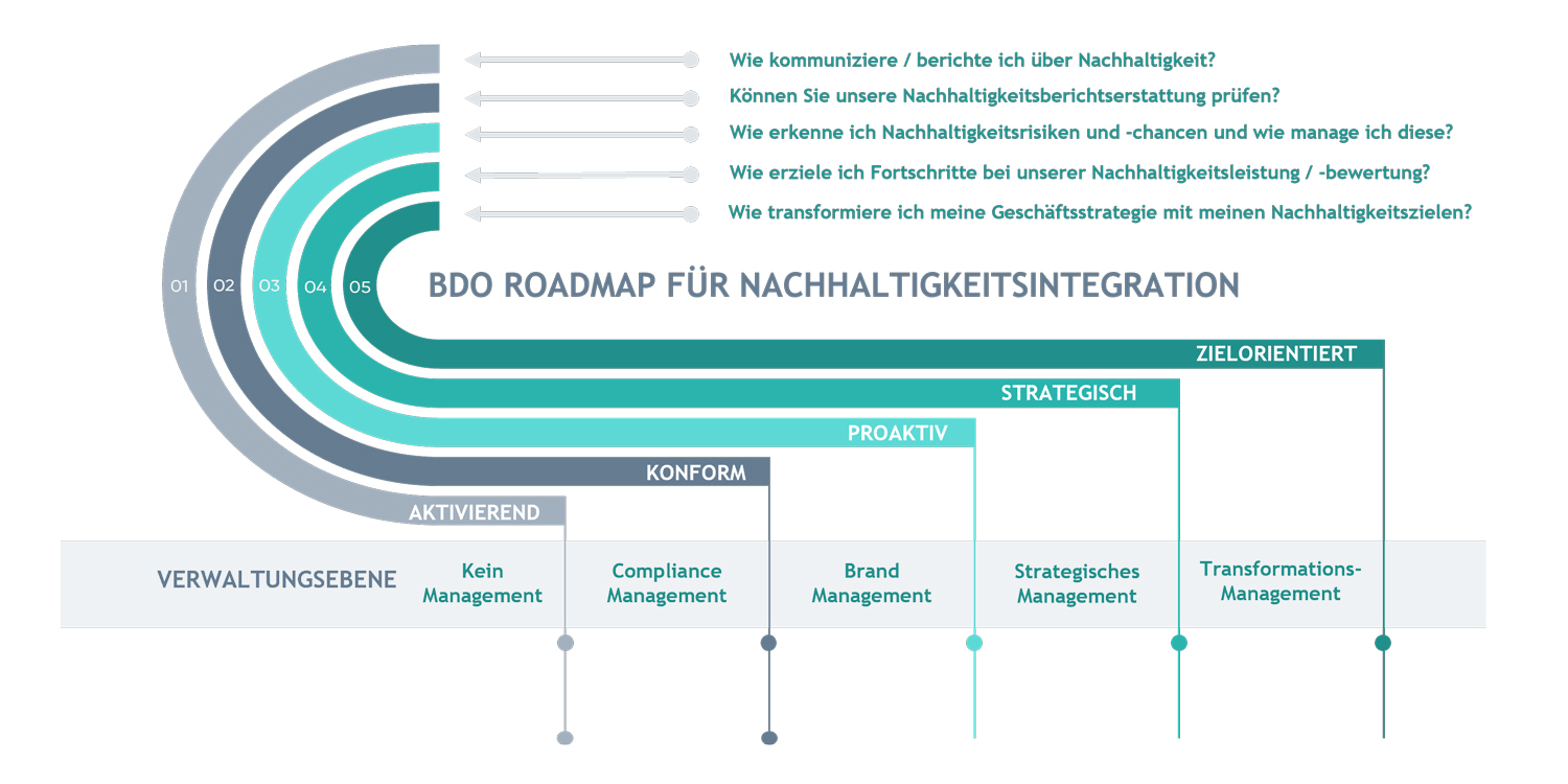 Trotz steigender Regulatorik ist die Implementierung eines Nachhaltigkeitsmanagements ein unternehmensindividueller Prozess. Manche Unternehmen starten bei null, andere wiederum haben sich bereits mit dem Thema auseinandergesetzt. Um hier einen Status Quo zu erfassen und darauf aufbauen die nächsten Schritte planen zu können, hat BDO eine fünfstufige Maturity Roadmap entwickelt, die den Weg der Nachhaltigkeitsintegration veranschaulicht. Sie soll dazu beitragen, die Komplexität von Nachhaltigkeit zu vereinfachen und den Wert zu fördern, den die Integration der Nachhaltigkeit für ein Unternehmen schaffen kann.